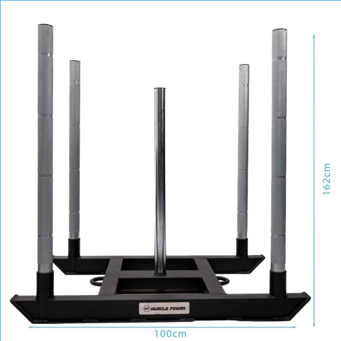 De Muscle Power competitie sled is gebouwd van stevig staalwerk en geschikt voor wedstrijden en competitie. De sled heeft 4 handgrepen met markeringen zodat je de handen op de juiste positie kan plaatsen volgens wedstrijd normen. De gestroomlijnde, aerodynamische constructie is afgestemd op het gebied van sled wedstrijden. Geschikt voor trek en duw training. De lange opslagpin is geschikt voor olympische halterschijven met een diameter van 50 mm en kan meer dan 150 kg aan gewicht kwijt.