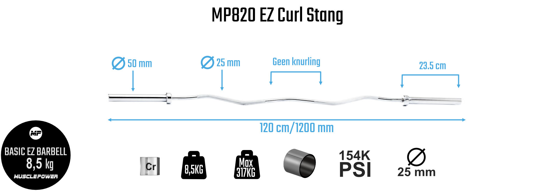 De MP820 EZ curlstang is een halterstang die special ontworpen is om je bovenarmen te trainen. Door de speciale getande vorm in de halterstang is deze zeer goed vast te houden bij oefeningen als de biceps curl, de triceps extension, preacher curl enzovoorts.
