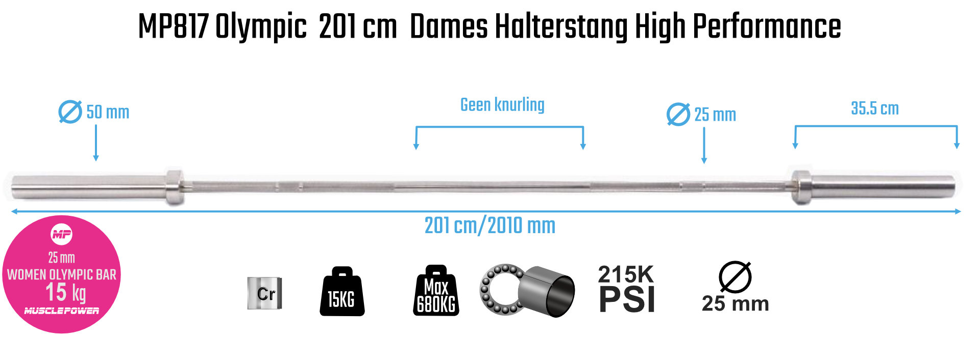 Deze halterstang is speciaal ontwikkeld voor het trainen door dames en is mulitfunctioneel. De lengte is 201 cm en weegt 15 kg. Geschikt voor gewichtheffen en powerlifting. De greep is 25 mm dik en ligt daardoor perfect in de hand, daarnaast bestaat de greep uit knurling en het middensegment is glad. De lagers bestaan uit zeer soepel draaiende needle bearing (naald) lagers en de uiteinden zijn afgesloten met metalen kapjes.