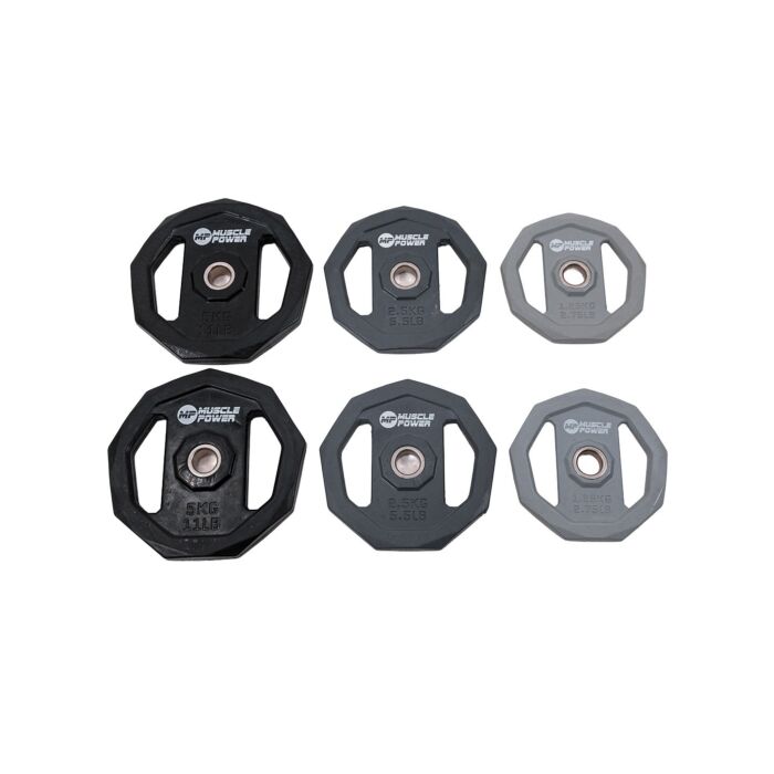 - Set bestaat uit: 2 x1.25 kg / 2 x 2.5 kg / 2 x 5 kg schijven