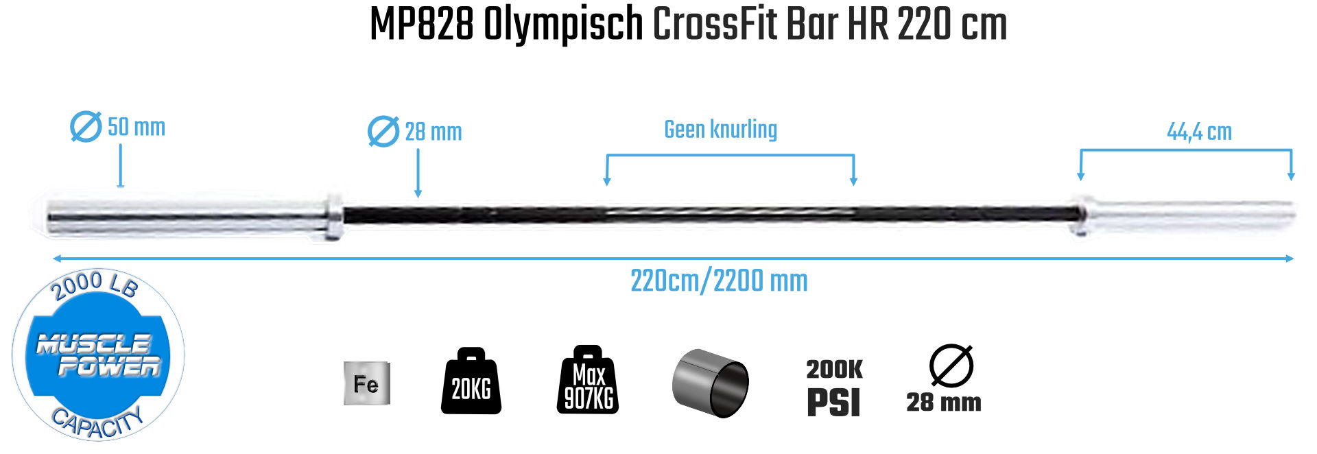 De MP Crossfit Bar is gemaakt voor de zwaardere oefeningen die meer vragen van de halterstang. De MP Crossfit Bars zijn gemaakt van 200,000 psi sterk veerstaal. Door de hoge kwaliteit van de staallegering van de stang kan deze Crossfit Bar de meest extreme oefeningen gemakkelijk overleven.